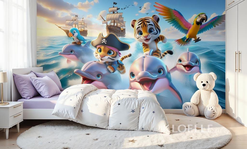 I det glitrende vand i et uendeligt blåt hav glider to små pirattigre hen over bølgerne på glade delfiner – et eventyr fyldt med smil, plask og venskab. Ved deres side svæver en farverig og legesyg papegøje over bølgerne og følger sine venner på denne fortryllende ekspedition. I det fjerne dukker et piratskib op i horisonten, som om det i stilhed holder øje med den magiske rejse. En idyllisk og livlig scene! Denne fototapet forvandler børneværelset til et sandt fantasi-hav, hvor havets magi og delfinernes glæde smelter sammen i en visuel oplevelse, der inspirerer til frihed, fantasi og ømhed.