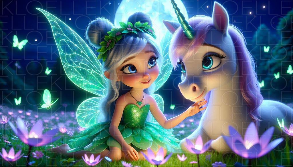 Under det bløde skær fra en stor fuldmåne, midt i en fortryllet skov, sidder en yndig lille fe med gennemsigtige grønne vinger ved siden af sin trofaste enhjørning. Med et roligt smil og et kærligt blik hviler hun ved sin ven – en hvid enhjørning med lilla man og et glitrende grønt horn, der lyser som en smaragd i måneskinnet. Magiske grønne sommerfugle svæver omkring dem, mens skoven fyldes med ro og glans. En scene som taget ud af et eventyr – perfekt til at forvandle pigeværelset til et fantasifuldt univers fyldt med farver og magi.