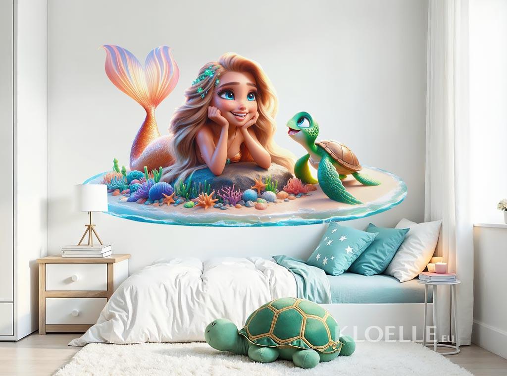 Børn Vægklistermærker Gylden Havfrue og Havskildpadde på den Paradisiske Strand | Kloelle