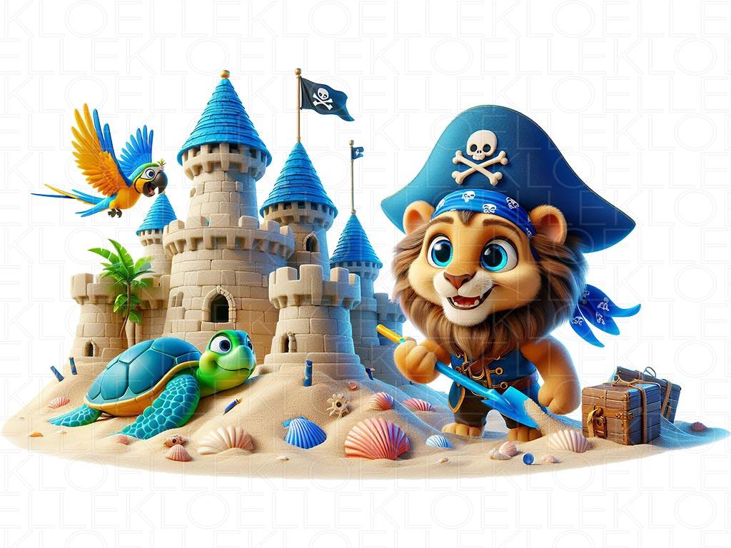 På en fortryllende strand bygger en sød lille piratløve med blå hat og nysgerrige øjne et stort sandslot med blå tårne. Ved siden af følger en venlig grøn havskildpadde med, mens to farverige papegøjer danser gennem himlen. Sammen deler de et eventyr fuld af sol, fantasi og varme, en magisk stemning, der forvandler ethvert børneværelse til en strandfyldt fantasiverden.