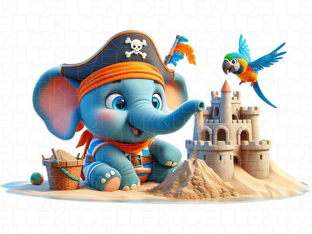 I den bløde strandsand er en lille blå elefant med pirathat i fuld gang med et glædesfyldt eventyr. Med sandede fødder bygger han et magisk sandslot, mens hans farverige og frække papegøjeven flyver omkring og sætter sig på tårnene. Sammen skaber de et øjeblik af ren magi, perfekt til at fylde drengeværelset med farver, fantasi og tropiske smil.