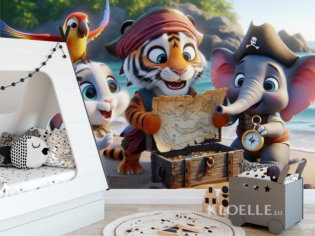 Fototapet Børneværelse Tiger, Elefant og Lille Kanin med Piratkortet | Kloelle