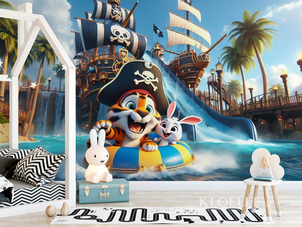 I et vandland inspireret af piraternes univers står to store sørøverskibe på toppen af en gigantisk vandrutsjebane. Mellem vandsprøjt og piratflag glider en lille modig tiger og hans ven, en hvid kanin, ned ad rutsjebanen i en farverig badering. De griner og sprøjter vand, mens de nyder en magisk tur, som var de to opdagelsesrejsende på de syv have. Sikke en perfekt dag! Forestil dig et børneværelse, hvor dette eventyr bliver til virkelighed — et levende rum fyldt med bevægelse og glæde, perfekt til små eventyrere der elsker leg og piratdrømme.