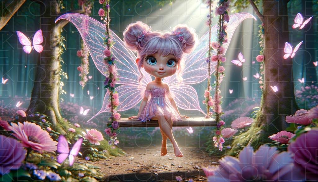 In einem verzauberten Wald erwachte eine kleine Fee zum sanften Gesang der Vögel. Auf einer mit Blumen geschmückten Schaukel sitzend, spürte sie die Wärme der Sonne auf ihrer Haut. Schimmernde Schmetterlinge tanzten um sie herum, als ob sie magische Geheimnisse teilten. Während sie sanft schaukelte, verstreute sie Feenstaub, der die Blumen um sie herum noch mehr zum Blühen brachte. Es war ein besonderer Tag: In diesem Moment feierte der ganze Wald die Harmonie der Natur, und die Fee, mit einem strahlenden Lächeln, wusste, dass ihre Aufgabe darin bestand, allen Lebewesen Freude zu bringen, die dort lebten. Die Magie blieb lebendig.