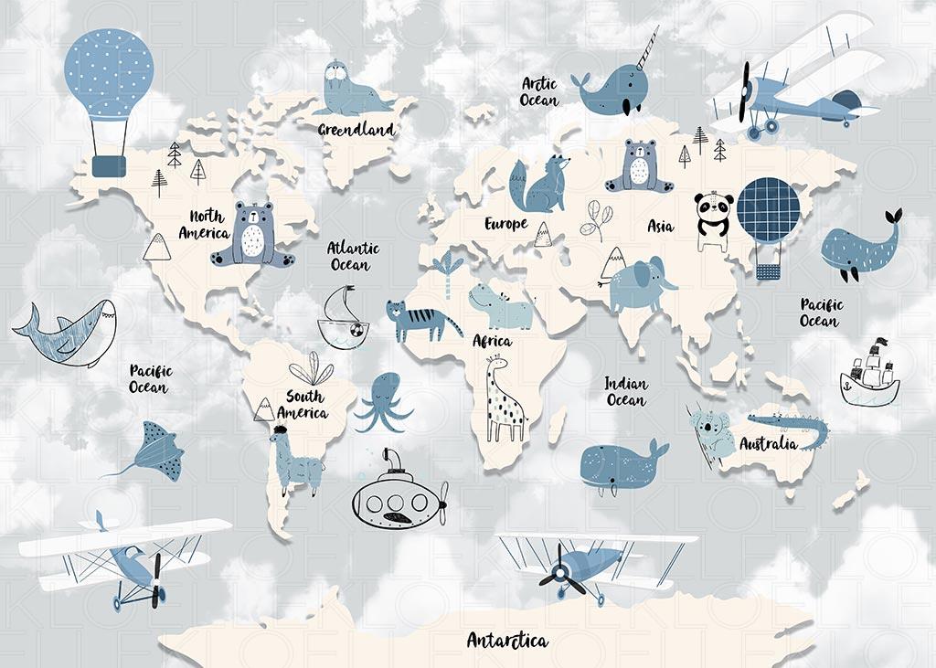 In einer ruhigen Welt, gemalt in sanften Tönen von Blau, Beige und Hellgrau, erwachen die Kontinente zum Leben – mit niedlichen Tieren, jedes in seinem natürlichen Lebensraum. Vom Eisbären in den eisigen Regionen bis zum Elefanten in den warmen Savannen lädt jedes Detail zum Entdecken ein. Am weiten, stillen Himmel schweben Retroflugzeuge und Heißluftballons sanft dahin, als erzählten sie Geschichten von fernen Reisen und bevorstehenden Abenteuern. Eine zauberhafte Szenerie, in der sich Geografie und Fantasie begegnen – und die Neugier kleiner Entdecker weckt. Verwandle das Kinderzimmer in einen Ort voller Ruhe und Entdeckungen mit dieser Weltkarte im skandinavischen Stil.