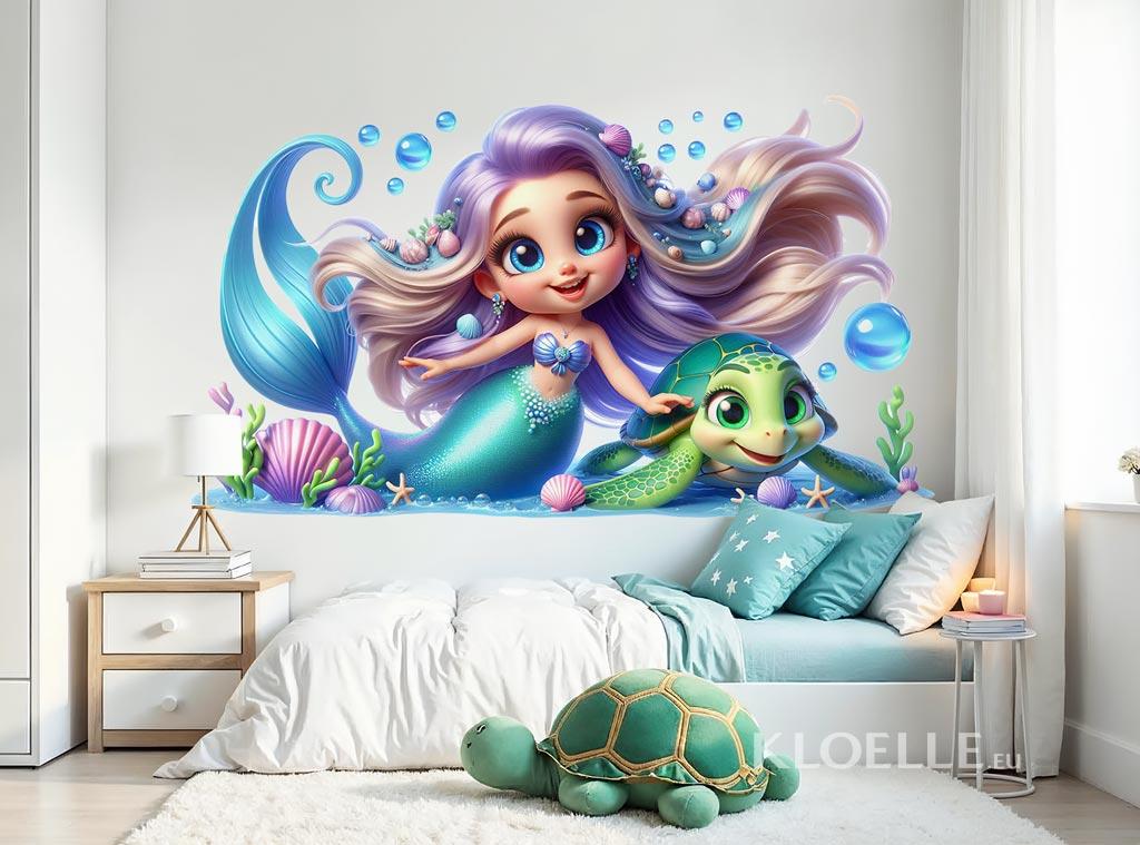 Kinder-Wandsticker Kleine Meerjungfrau mit Grüner Schildkröte | Kloelle