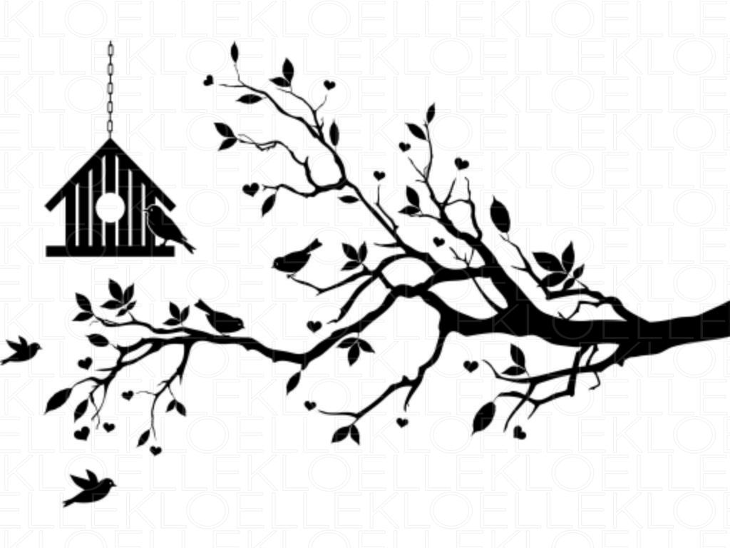 Benutzen Sie unsere Wandtattoos, um Ihr Schlafzimmer oder Wohnzimmer aufzuwärmen. Diese Schattenbilder kennzeichnen eine Familie der Vögel und ihres Vogelhauses, das von einer Niederlassung des Liebes-Baums hängen.