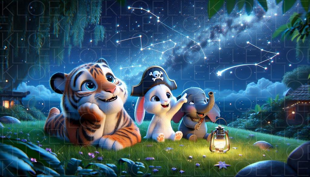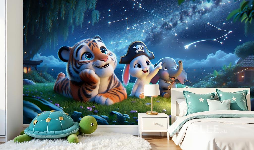 In einer ruhigen, sternenklaren Nacht blicken drei verträumte Freunde mit neugierigen, liebevollen Augen zum Himmel. Ein liebevoller Tiger, ein kleiner weißer Hase mit Piratenhut und ein sanftes Elefantenbaby teilen die stille Magie der Nacht und bewundern die funkelnden Sternbilder über ihnen. Umgeben von Sternen, Träumen und Freundschaft entsteht eine friedliche, zauberhafte Szene – perfekt für die Wanddekoration im Kinderzimmer, wo jeder Blick zu einem Wunsch wird, der den Sternen folgt.