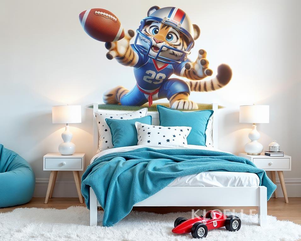 In der Stille vor dem entscheidenden Spielzug kniet ein ganz besonderer Tiger — ein echter American-Football-Spieler — auf dem Rasen, mit aufmerksamem Blick und ausgestrecktem Arm, bereit, den Ball zu fangen, der auf ihn zufliegt. Voller Stil und Mut wartet er auf den perfekten Moment, um zu glänzen – wie die wahren Helden auf dem Spielfeld. Die Lieblingsecke im Kinderzimmer verwandelt sich nun in ein Spielfeld, auf dem Fantasie frei läuft, die Leidenschaft für das Spiel lebendig wird und jedes Detail zum Abenteuer einlädt. Dieser Wandsticker, voller Energie und Bewegung, bringt die Wand im Kinderzimmer zum Leben und verleiht dem Raum eine sportliche Note – ideal für Kinder, die jedes Spiel wie ein echter Champion erleben.