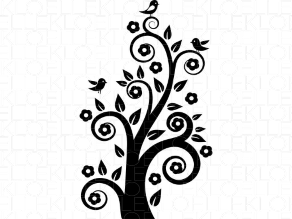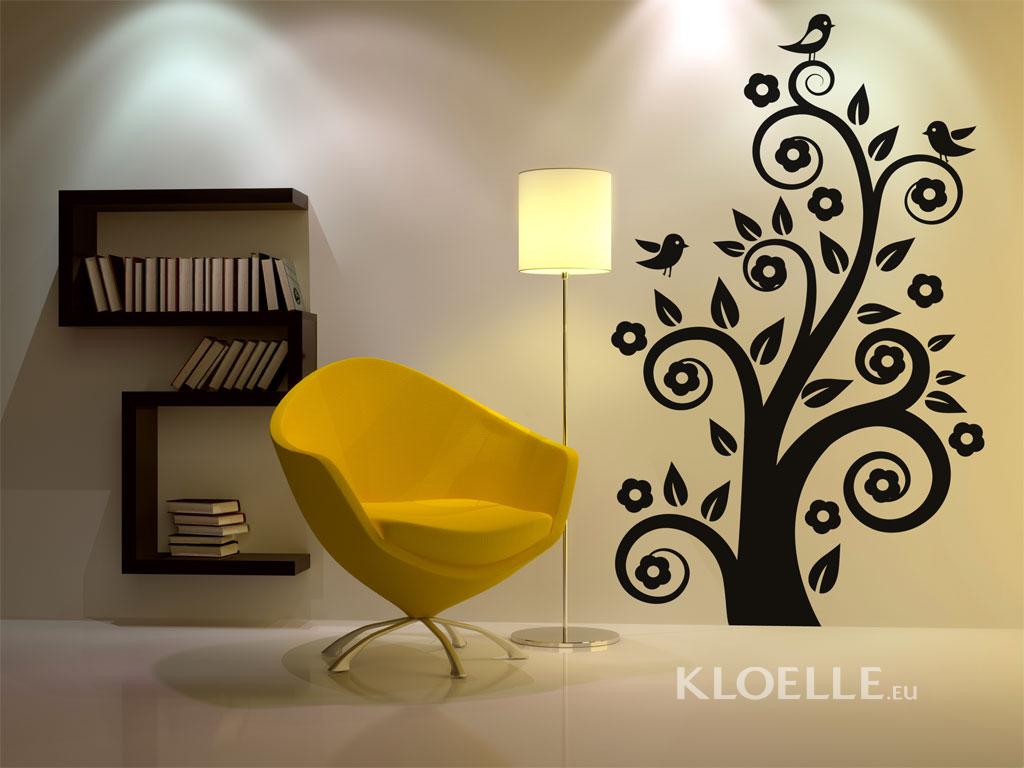 Floral Wandtattoos und Wandstickers mit Vögeln. Zur Dekoration Ihres Wohnzimmers fügen Sie einen kurvigen Baum mit all seinen Zweigen, Blättern und Blumen und ein Trio von entspannten Vögeln hinzu.