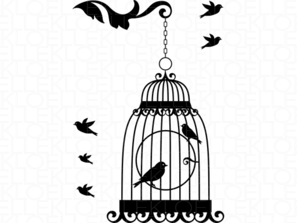 Wall decals on the theme of nature and gardens. This sticker set features the silhouettes of a flock of birds, some of them flying, others resting inside a vintage birdcage.