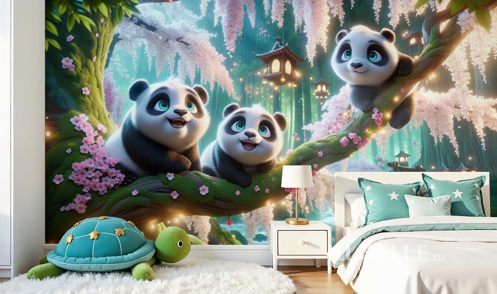 In an enchanted forest where the fragrant breeze dances among the leaves, stands a majestic cherry blossom tree covered in delicate white and pink flowers. Seated on one of its tall, welcoming branches, three sweet pandas share joyful smiles as they plan their next adventure. The sturdy trunk holds ancient secrets, while the greenery around them glows in the magical light. A tender and imaginative scene — perfect for filling the children’s room with serenity and wonder.