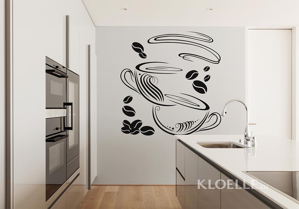 Wall stickers for your kitchen or a covered balcony. Apply on a wall this decal of two full cups of coffee who dare to embrace amidst a crowd of toasted coffee beans.