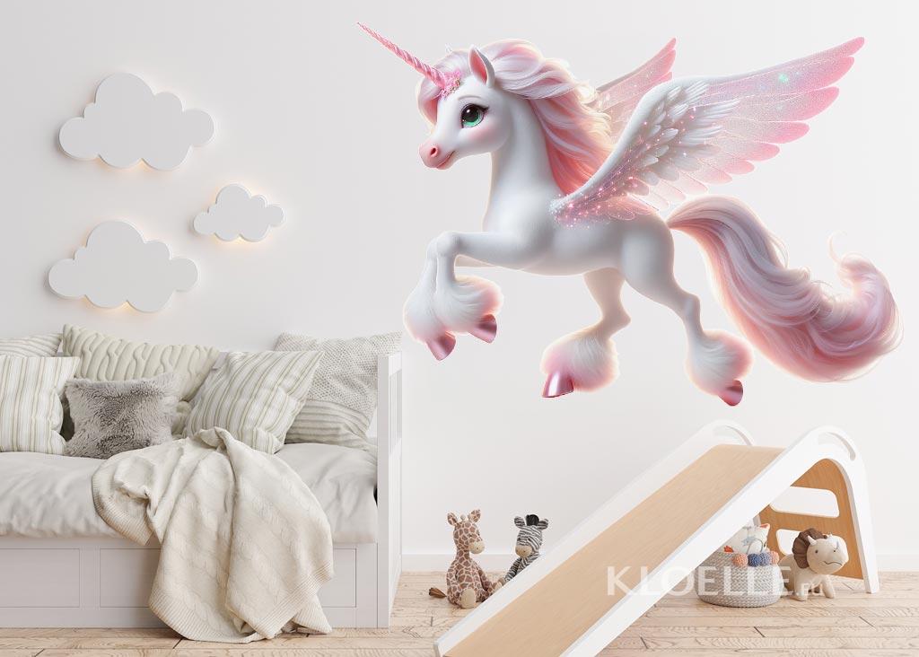 Once upon a time, there was a white and pink unicorn who lived in a secret kingdom, where only the sweetest dreams could enter. With its soft pink mane and tail glowing in the sunlight, and long sparkling wings that seemed made of magic, it gently flew over golden fields and enchanted streams. With every flap of its wings, it spread joy and wonder, leaving a trail of light in the air. They say that wherever it rests, the most beautiful dreams are born. A magical story brought to life on the wall — perfect for turning any child’s room into a world of colour, imagination and tenderness.