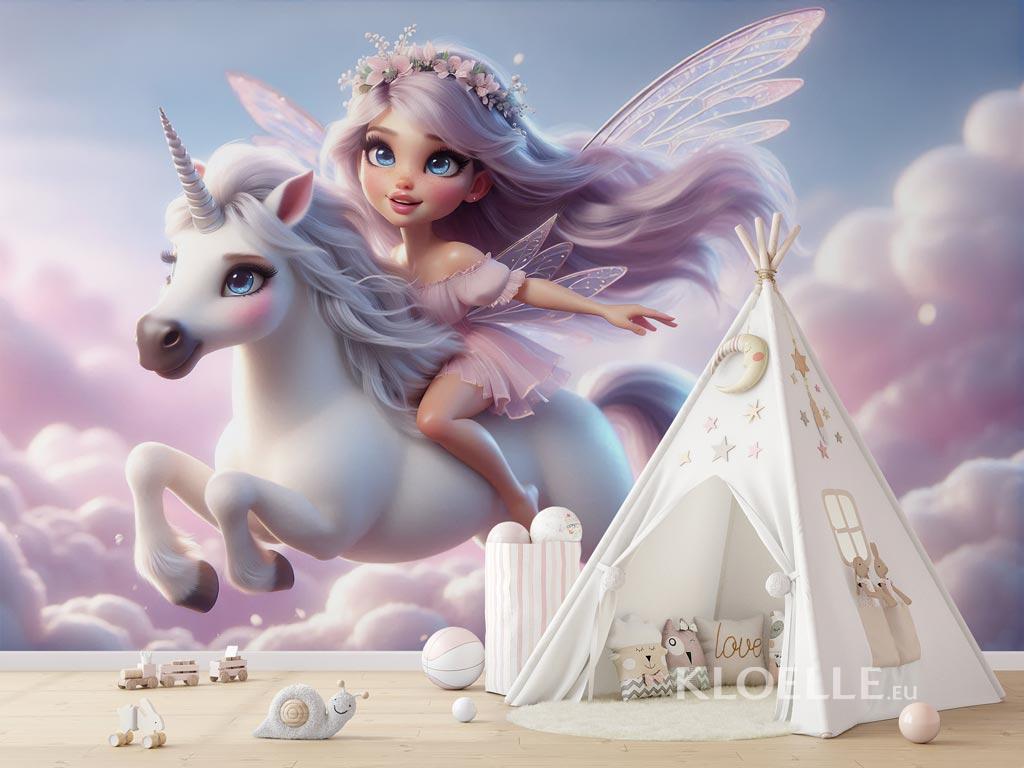 Kids' Room Wall Murals Fairy and Unicorn Galloping on Pink Clouds | Kloelle