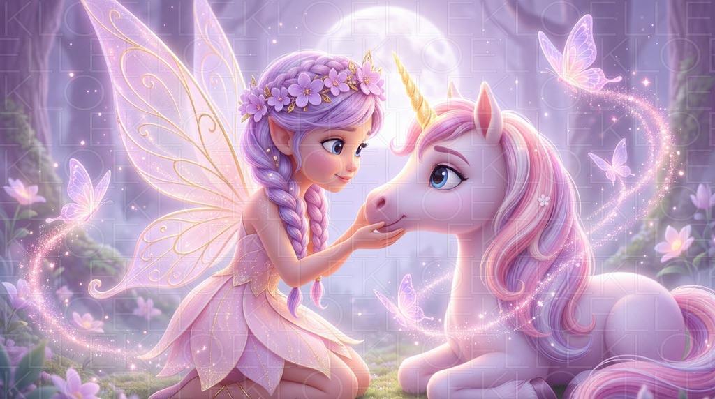 Fairy and Unicorn in the Forest in Lilac and Pink Tones