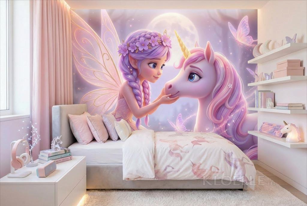 In a serene forest, where everything glows in soft lilac tones, a little fairy with shimmering wings gently talks with her magical unicorn friend, with a pink and lilac mane. Together, they remain among enchanted trees, accompanied by delicate butterflies dancing in the air. The scene conveys sweetness, calm and magic — like a fairy tale brought to life. This wall mural for kids' room, filled with charming details, transforms a girl’s room into a true fairy tale.