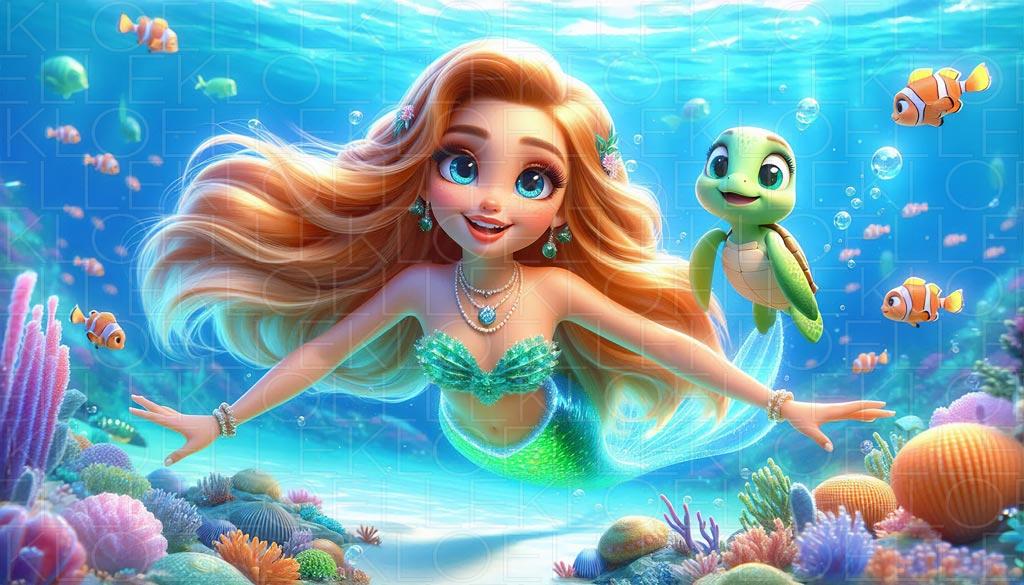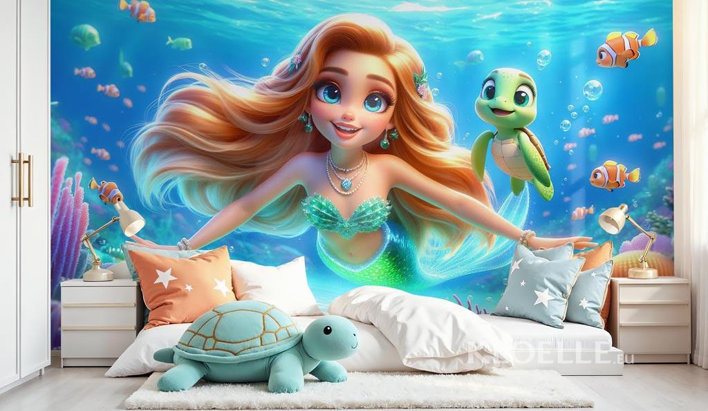 In the turquoise depths of the sea, near a tropical island, lives a sweet mermaid with long golden hair and a shimmering tail that lights up everything around her. By her side, her loyal friend — a little green sea turtle — swims joyfully, sharing moments full of fun and friendship. With splashes and giggles, the two explore the colourful coral reefs and curious little fish. This magical scene transforms the room of girls who love mermaids and sea adventures into a truly enchanted retreat. The feeling is magical and immersive — this wall mural for a girl's room, with radiant colours and charming details, brings the sweet sensation of being right there, in the turquoise waters of the tropical island!