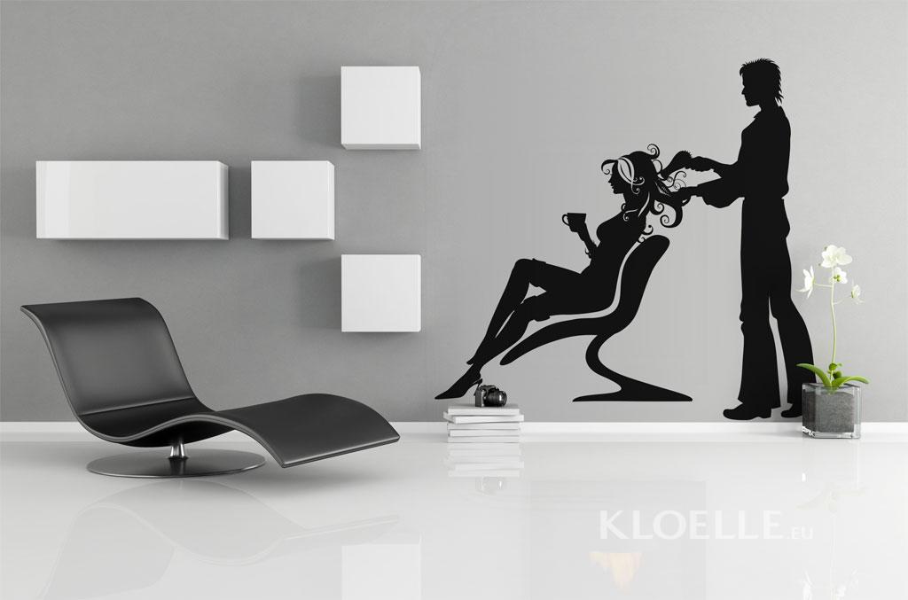 Hairdressers deal mostly with hair, but they also help their clients relax and feel good. With this in mind, we suggest you place this wall decal in your hair salon. It features a hairdresser drying the curly hair of a client who is sitting comfortably and drinking a tea.