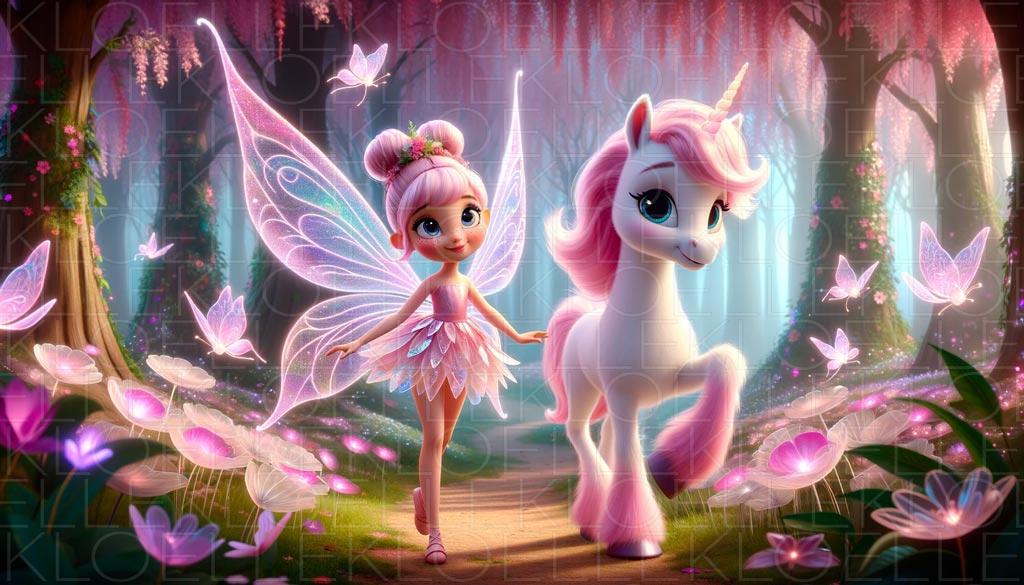 In a serene forest where everything glows in soft shades of pink, a little fairy with sparkling wings strolls alongside her magical unicorn with a pink mane. Together, they wander through enchanted trees, surrounded by delicate butterflies dancing in the air. The scene is filled with sweetness, calm, and magic — like a fairy tale come to life. This wall mural for a girl's room, full of charming details, transforms the space into a true fairy tale, inspiring sweet dreams and moments of imagination. A delicate and charming choice to decorate with beauty and harmony.