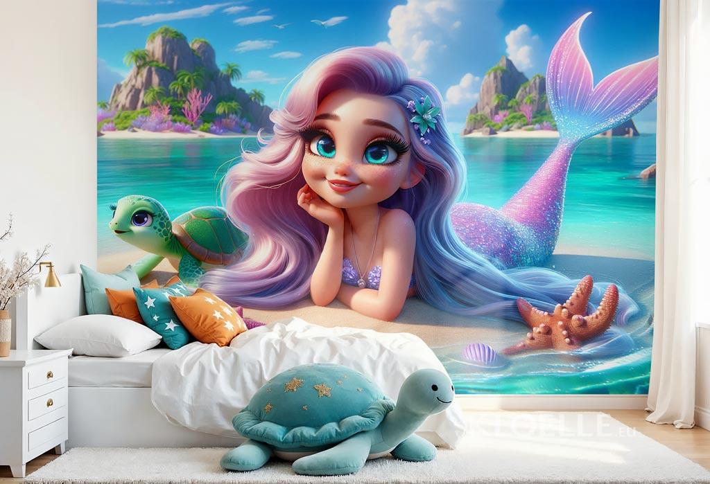 What a charming scene! A lovely mermaid rests by the sea with her turtle friend, on a turquoise beach that radiates calm and beauty. This wall mural for kids' rooms opens a real window into the magical world of mermaids. Perfect for a girl's room, it completely transforms the wall decor, filling the space with colour and imagination. The image is so vivid and well placed that it feels like part of the wall — as if you’re right there, next to the mermaid, living out her magical story.