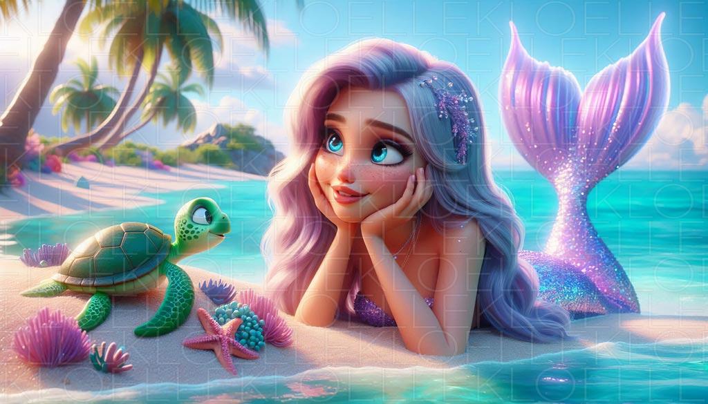 In this enchanting scene inspired by a true mermaid tale, an adorable mermaid with a long shimmering lilac tail and soft lilac silky hair chats happily with her loyal friend — a sweet and smiling sea turtle. Together, they rest on the sand, surrounded by delicate corals, swaying palm trees, and the peaceful glow of the turquoise sea, sharing stories and secrets from the ocean. This wall mural for kids’ rooms completely transforms the wall decor, creating an immersive setting that transports little ones to a magical world of friendship and seaside adventures. Perfect for a girl's room, especially for those who dream of mermaids and love the marine theme, this wall mural becomes a portal to imagination — where every detail invites play, wonder and new beachside adventures.