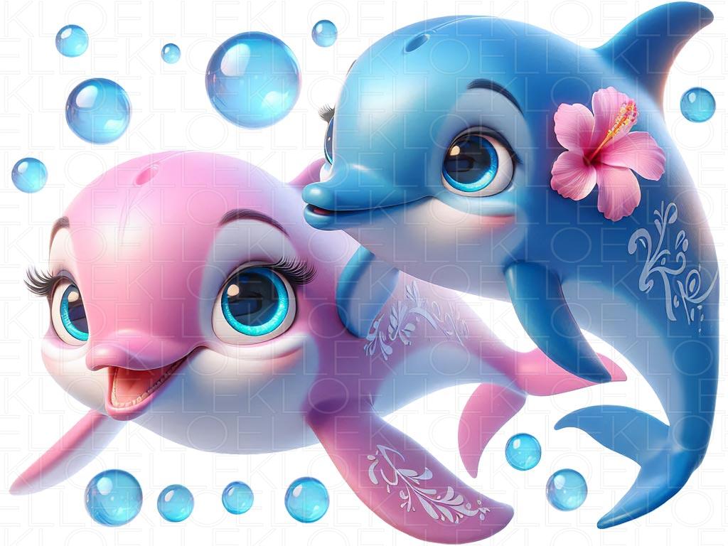 Bring the nursery wall to life with this sweet and charming scene: a dolphin couple — one pink and one blue — swimming together in a tender moment. The blue dolphin wears a delicate hibiscus flower, making the scene even more loving and special. With an enchanting composition, this wall sticker for kids' room creates a calm and joyful atmosphere inspired by the ocean — perfect for a baby’s room or a child’s room.