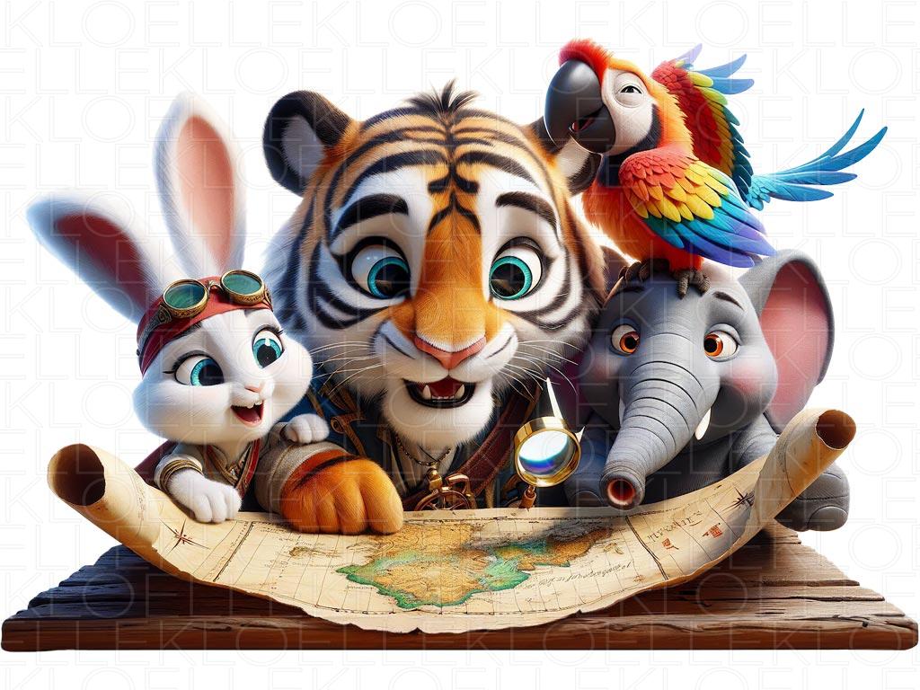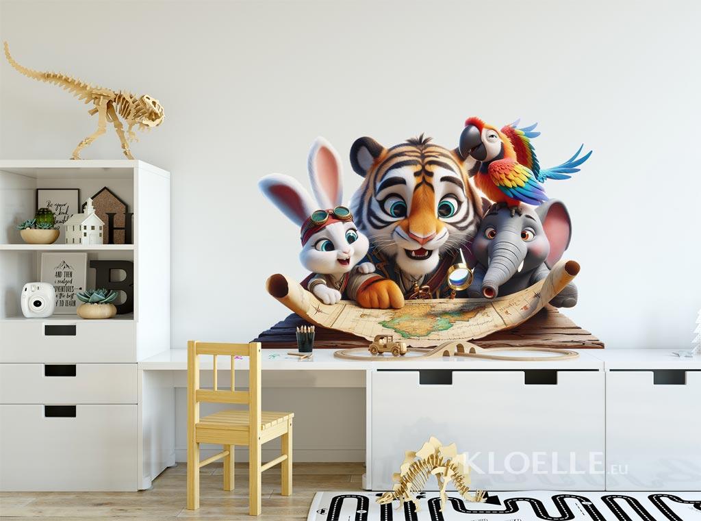 Four inseparable adventurers — a brave pirate tiger, a curious little bunny, a smiling elephant and a clever parrot — gather around an old treasure map. With bright eyes and hearts full of excitement, they discover clues that lead them to the mysterious Coral Island. Filled with laughter and discoveries, their journey is full of wonder. What a charming scene — perfect for decorating the most special corner of a child’s room.