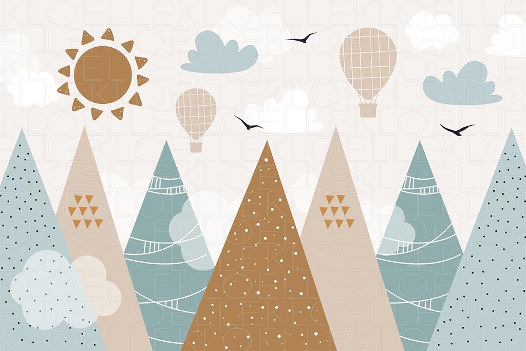 Soft mountains in pastel green and beige stretch across a peaceful and charming Scandinavian landscape. Light clouds drift gently through the calm sky, while delicate hot air balloons float above as if in a quiet dream. A harmonious composition that brings peace and imagination, perfect for creating a cosy, sweet and magical atmosphere in a room for babies and children.