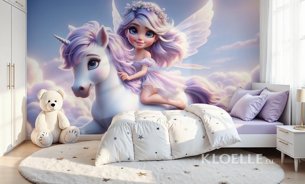 Kids' Room Wall Murals Sweet Fairy and Her Unicorn Galloping in the Clouds | Kloelle