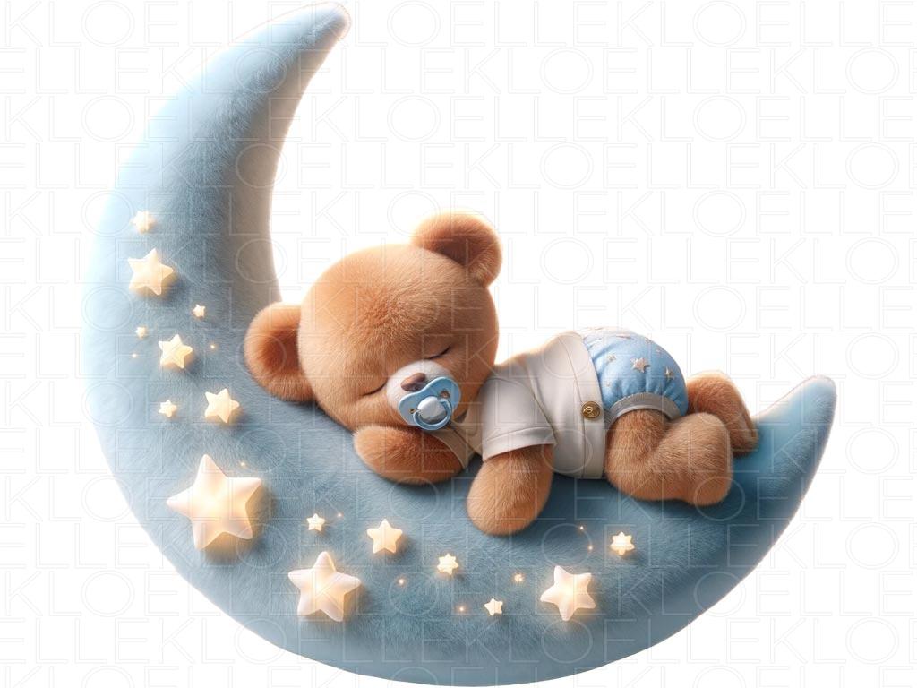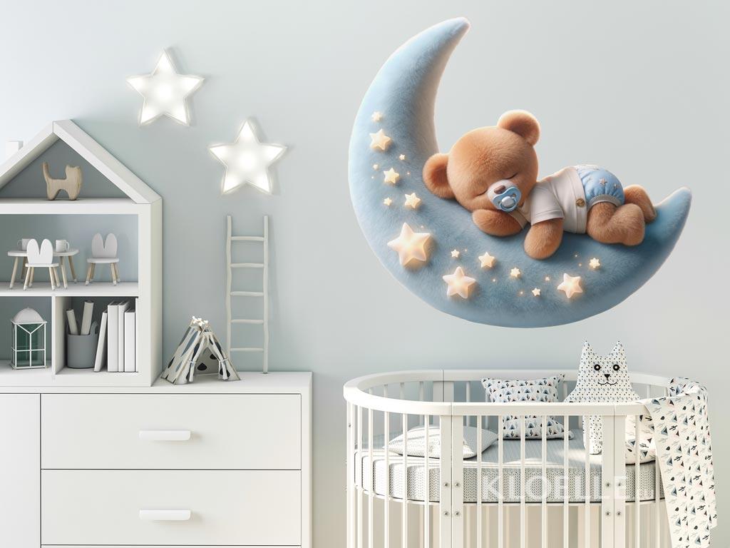 In the cosiest little corner of a nursery, lives a small teddy bear who loves to sleep on his blue moon. The moon, soft as cotton, glows with little white stars that gently light up his peaceful dreams. Cuddled in the curve of the moon, the sweet teddy sleeps calmly, rocked by the quiet and the soft lights that twinkle all around. Nothing disturbs him — everything is filled with tenderness and calm. A magical and heartwarming scene, perfect to add charm and comfort to babies’ and children’s room décor.