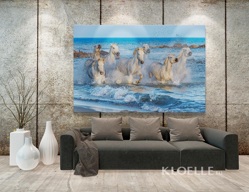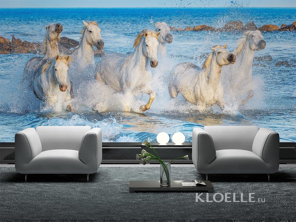 Wall mural for animal lovers to decorate a bedroom or living room. Feel refreshed by the sight of this herd of vigorous wild white horses taking a quick bath near the beach.