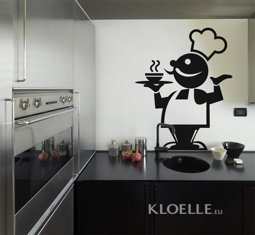 Hay gente a la que le encanta charlar con el chef de un restaurante y intercambiar opiniones gastronómicas. Coloca en la pared de tu cocina un vinilo decorativo que haga referencia a esa simpática manía tuya como, por ejemplo, este autoadhesivo en el que un chef parlanchín se dirige a ti con un cuenco lleno de sopa humeante y aromática.