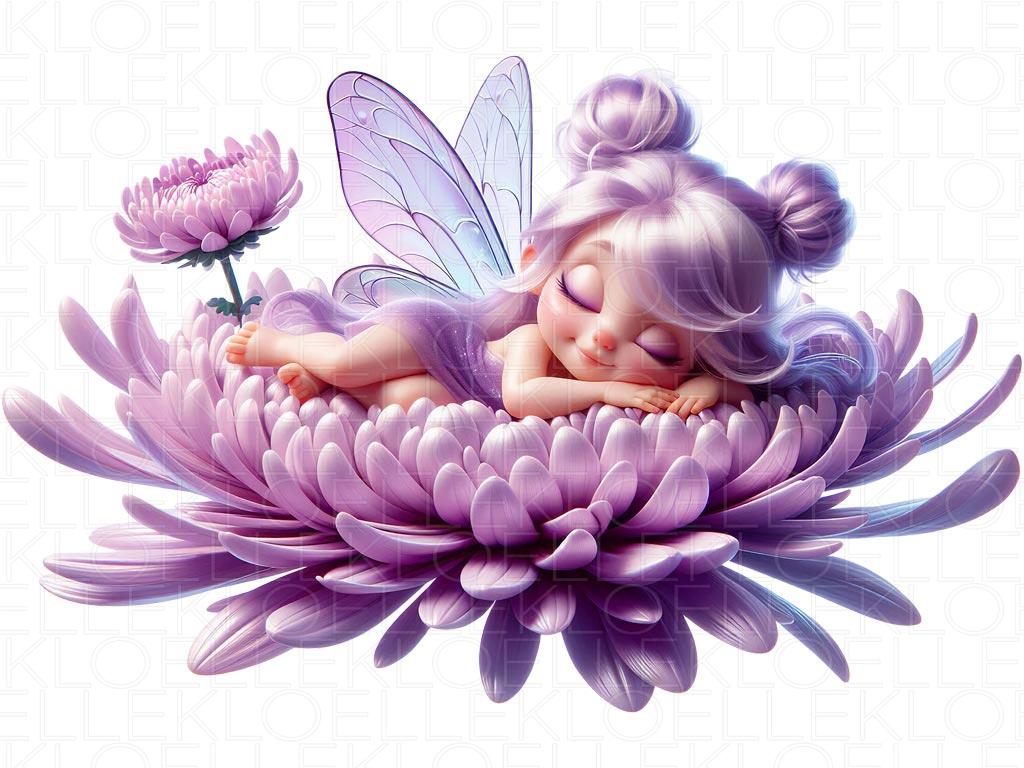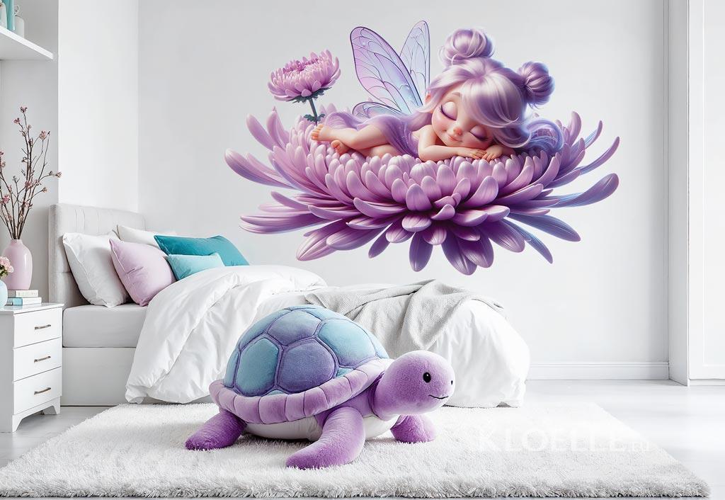 En el rincón más bonito de un bosque encantado vive un hada soñadora que duerme plácidamente sobre los suaves pétalos de una flor de gerbera. Envuelta en calma y magia, descansa con dulzura mientras la luz del sol acaricia su carita. Las mariposas cuidan de su sueño y el viento le canta nanas suaves. Un momento tierno y sereno, lleno de encanto e imaginación — ideal para aportar color, dulzura y fantasía a la decoración del dormitorio de bebés y niñas.