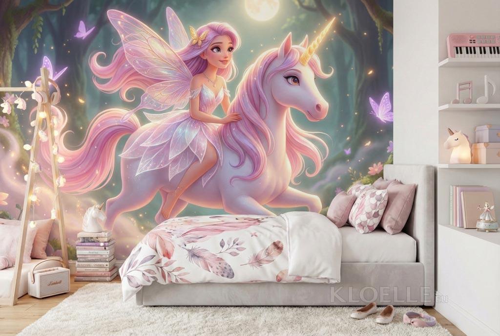 Hada y Unicornio en el Bosque en Tonos Rosa y Lila