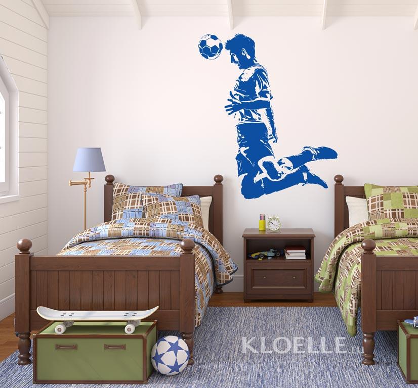 ¡Gol! El fútbol es el deporte más jugado en el mundo y el más discutido en las cantinas, en el recreio, en los cafés... Mueve corazones y mueve naciones. Muestra tu pasión por este deporte con un autoadhesivo de vinilo decorativo que puedes colocar en una pared de tu habitación, en el que un jugador realiza un pase de cabeza. ¿Logrará marcar un gol?