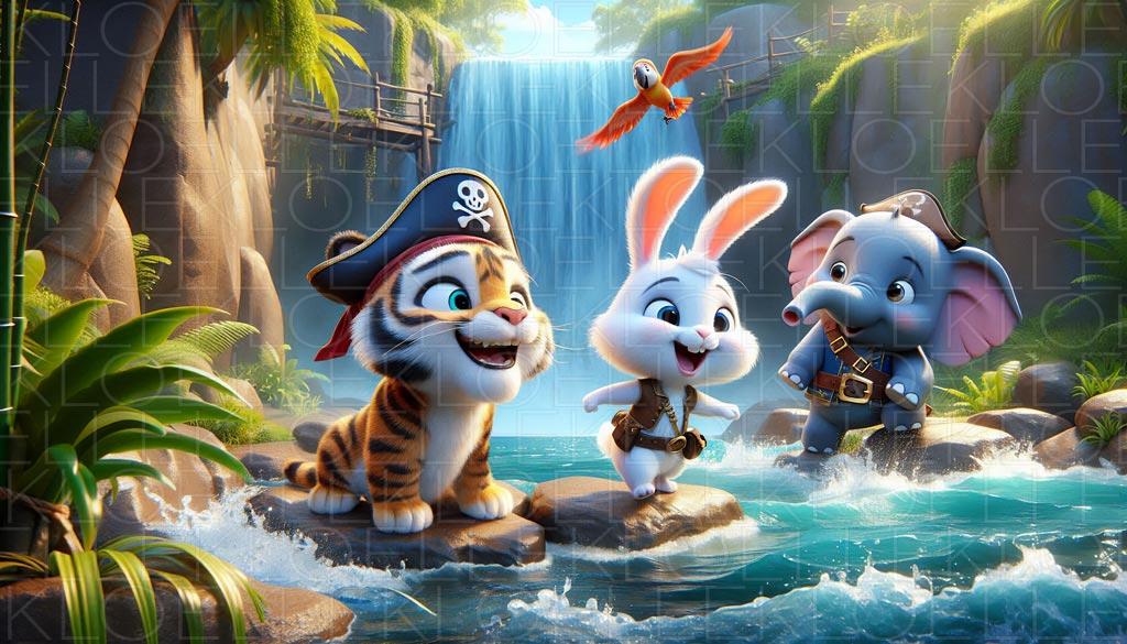 Tigre, Elefante y Conejito en la Cascada de la Selva