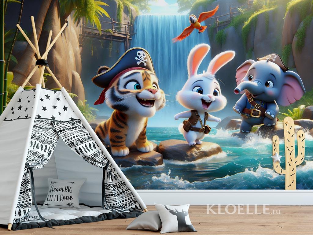 Fotomurales Habitación Infantil Tigre, Elefante y Conejito en la Cascada de la Selva | Kloelle