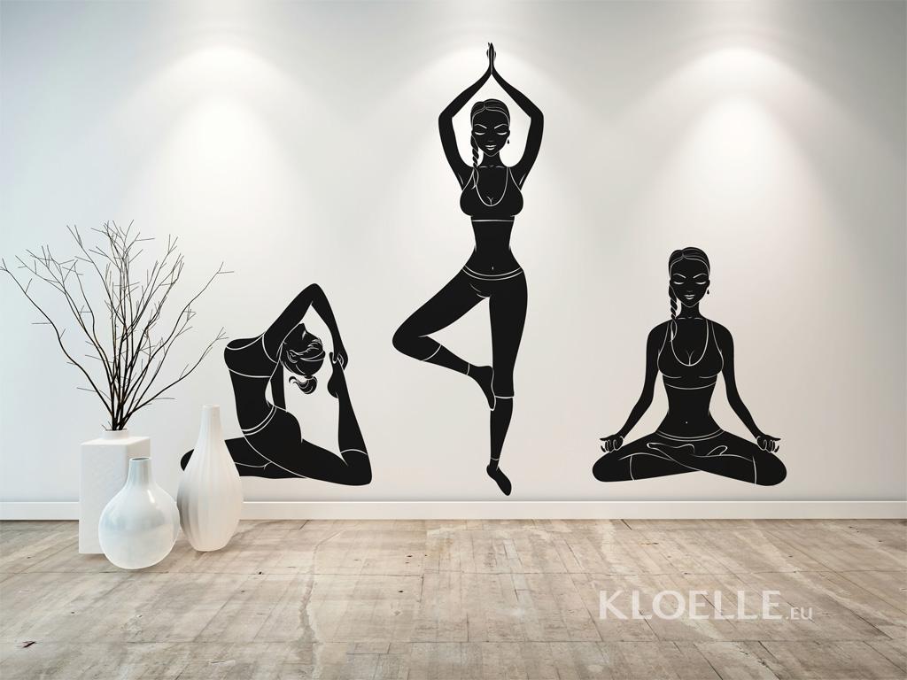 Vinilos decorativos para la decoración de paredes y puertas de un centro de yoga o salón de meditación. Estos autoadhesivos ilustran tres posturas distintas de yoga, o asanas: en la imagen arriba, de la izquierda hacia la derecha, tenemos la paloma, el árbol y el lótus.