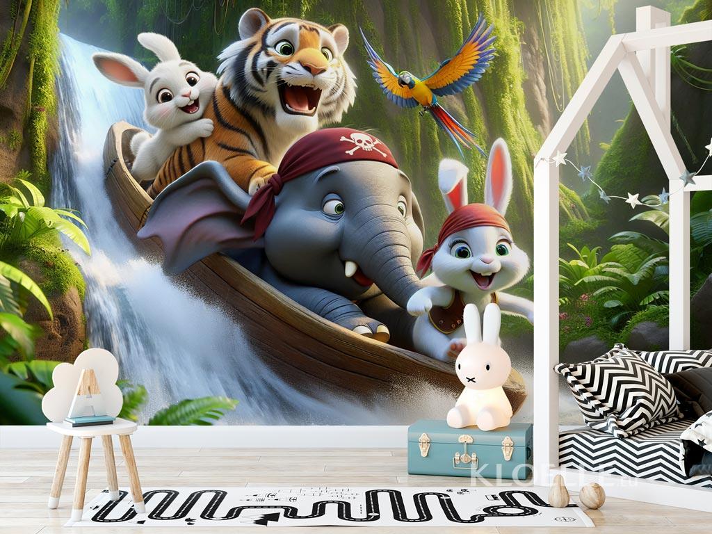 Papier Peint Chambre Enfant Cascade Tropicale avec des Animaux de la Jungle | Kloelle