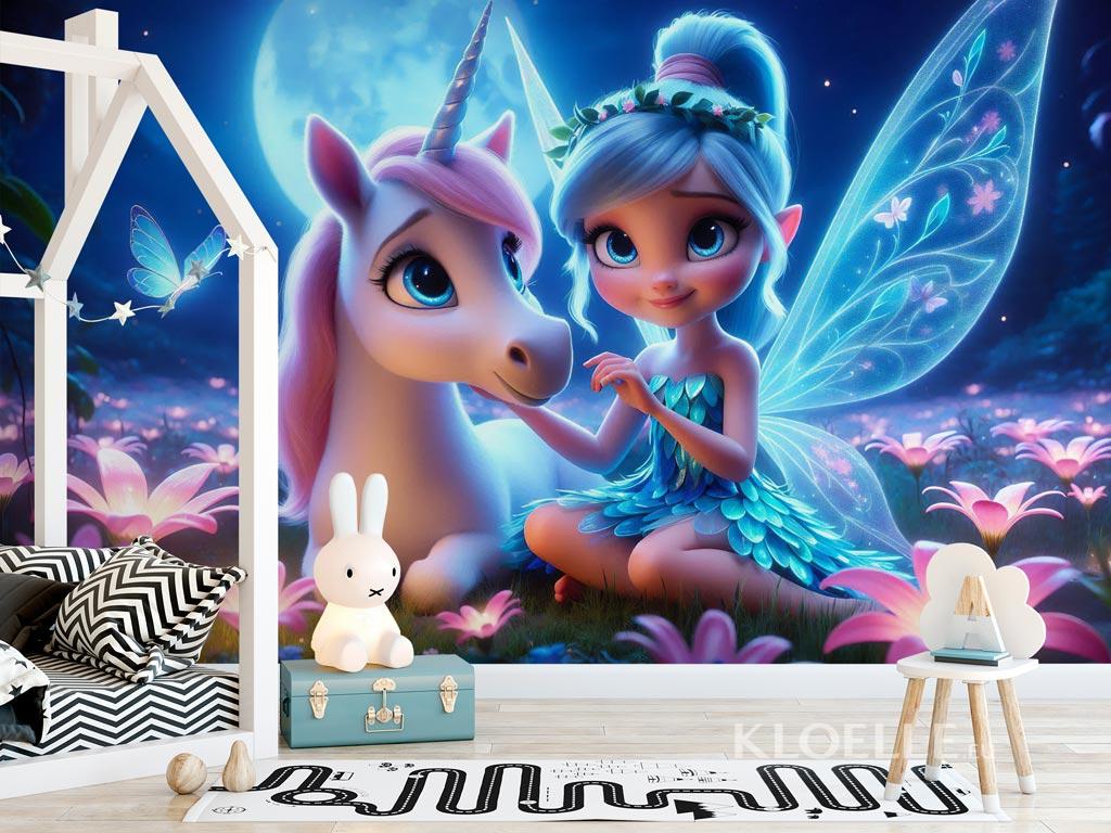 Papier Peint Chambre Enfant Fée et Licorne dans la Forêt Magique au Clair de Lune | Kloelle