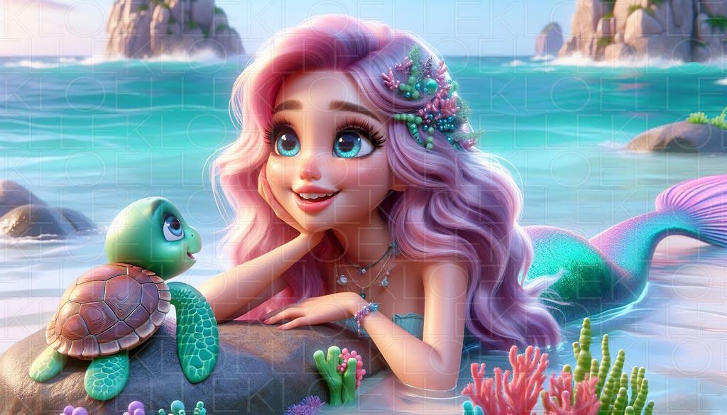 Sur une plage tropicale aux eaux turquoise, une sirène aux cheveux roses et à la longue queue verte et rose se repose sur un rocher recouvert de coraux, au bord de la mer. À ses côtés, sa petite amie fidèle, la tortue marine verte, l’écoute avec attention et enthousiasme pendant qu’elles imaginent leur prochaine aventure sur l’île enchantée. Remplie d’éclat, de tendresse et d’amitié, cette scène douce et colorée transforme le mur de la chambre des filles en un décor magique où les rêves prennent vie au bord de la mer.