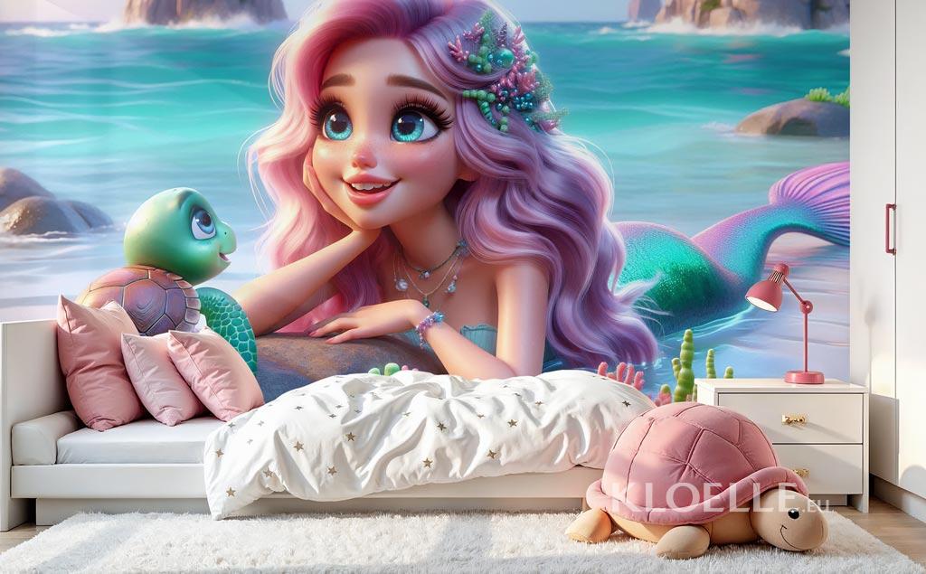 Papier Peint Chambre Enfant Sirène et Tortue Marine sur la Plage Tropicale | Kloelle