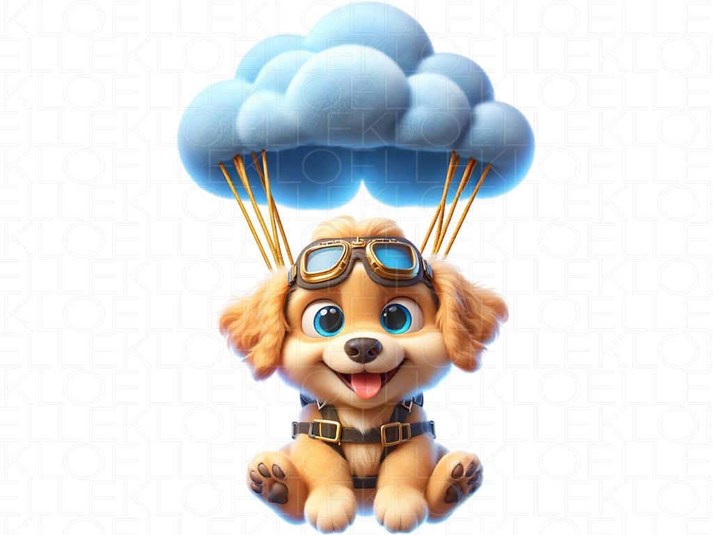 In un cielo pieno di luce e fantasia, un cucciolo di Golden Retriever allegro e avventuroso scende dolcemente con il suo paracadute a forma di soffice nuvola blu. Con gli occhiali da aviatore retrò e un sorriso felice, trasforma ogni momento in un volo di immaginazione e allegria. Questa scena incantevole riempie la cameretta di leggerezza, colore e sogni per piccoli esploratori che amano volare.