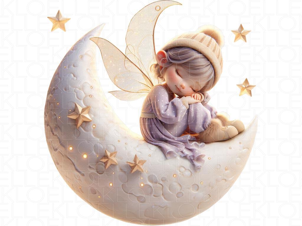 C’era una volta, in cima al cielo stellato, una dolce fatina dormiva serenamente sdraiata su una luna scintillante. Avvolta nelle sue ali dorate, sorrideva nel sonno, sognando campi di fiori e stelle danzanti. La luna brillava piano, cullandola nel silenzio, mentre piccole lucciole volavano intorno per proteggerla. Tutto era calmo e incantato. Una scena tenera e sognante — perfetta per aggiungere un tocco magico e delicato alla cameretta di neonate e bambine.
