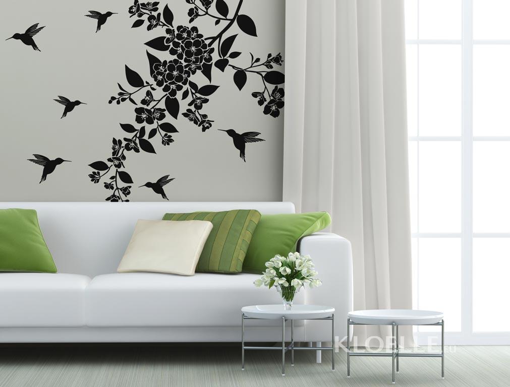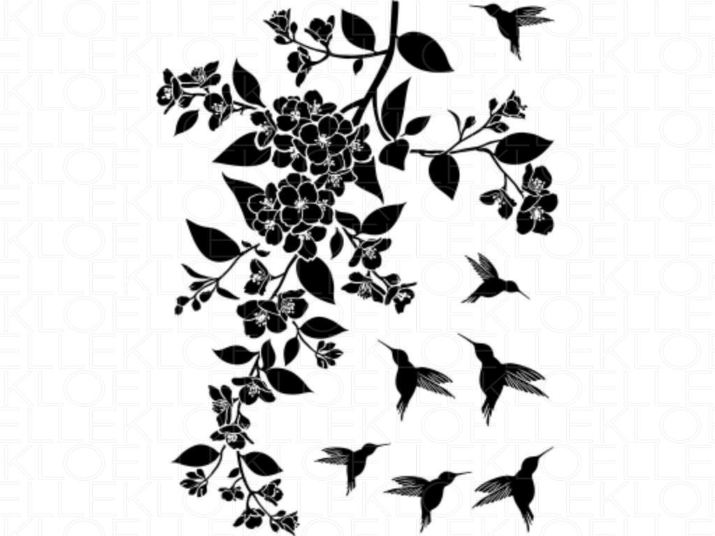 Addolcisci l'arredamento con adesivi murali con motivi e disegni floreali. Metti sotto la cornice del tuo salotto o ufficio questo affascinante sticker con un ramo pieno di fiori di gelsomino che seduce uno stormo di colibrì.