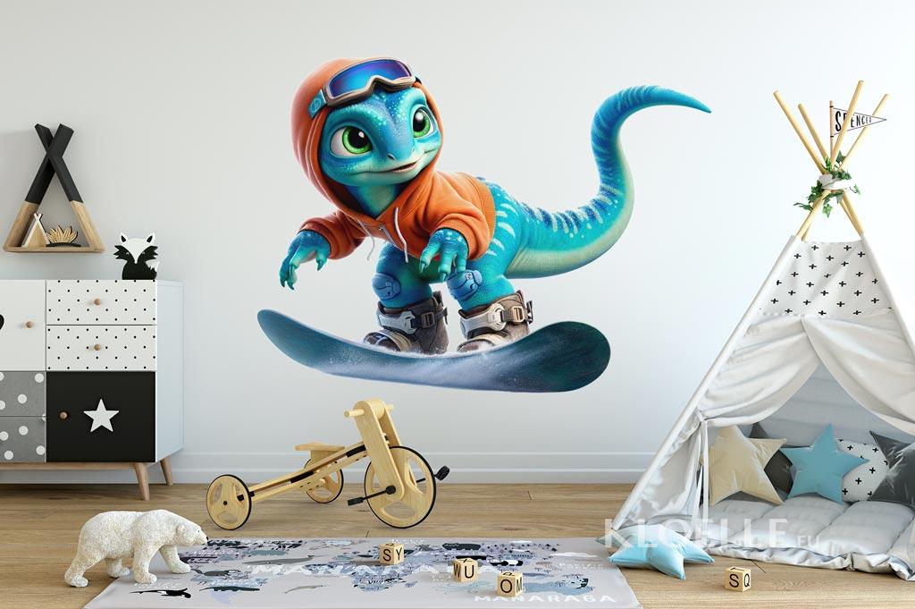 Muurstickers voor Kinderen Blauwe Dino op een Snowboard | Kloelle