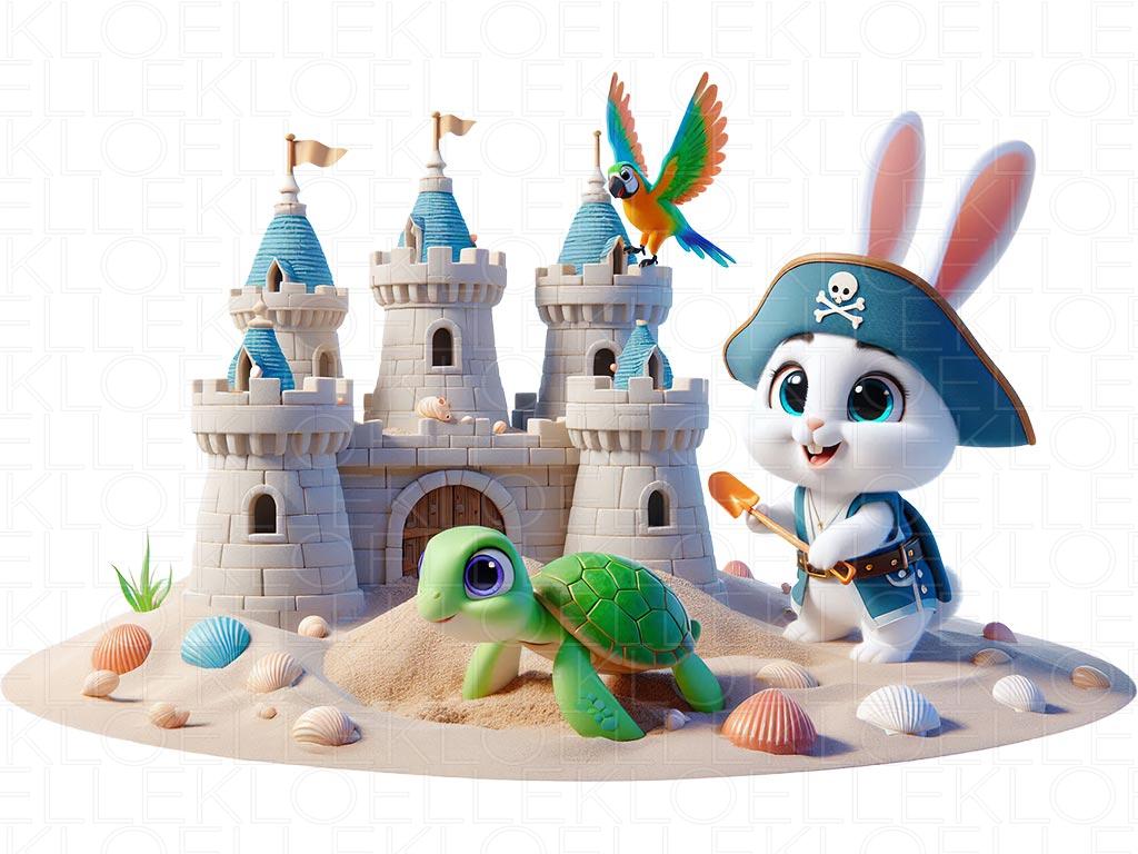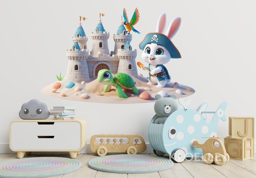 Muurstickers voor Kinderen Piraatkonijn en Zeeschildpad op het Strand | Kloelle