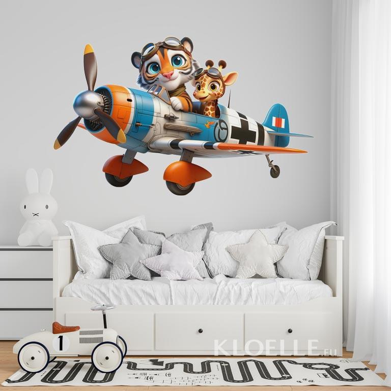 Muurstickers voor Kinderen Retro Vliegtuig met Tijger en Giraffe | Kloelle