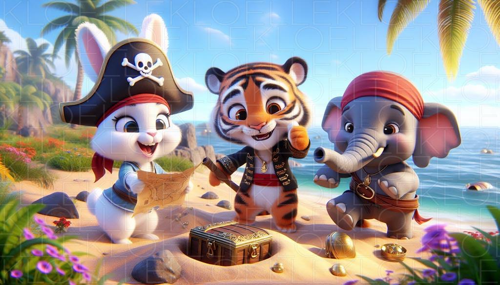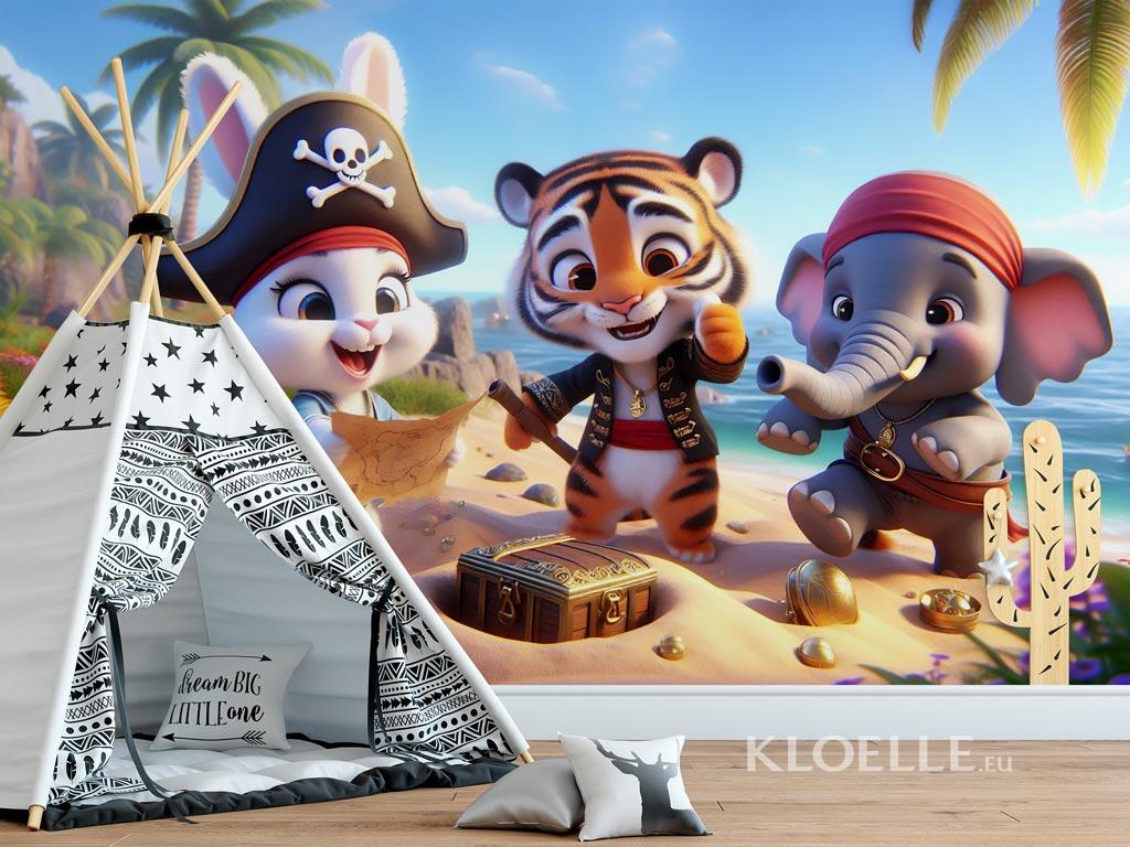 Op het Koraaleiland, waar de golven geheimen fluisteren en de zon het gouden zand verwarmt, doen drie heel bijzondere vriendjes een magische ontdekking. De lieve en nieuwsgierige tijger graaft met zijn pootjes in het zand tot hij iets glinsterends vindt. Naast hem heft de olifant met een piratenbandana enthousiast zijn slurf op, terwijl het glimlachende konijntje met zijn piratenhoedje vrolijk opspringt. Samen hebben ze net de verloren schatkist gevonden! Dit fotobehang voor de kinderkamer is een uitnodiging voor zee-avonturen waarbij elk detail de muur tot leven brengt. Een tafereel vol kleur en tederheid dat de fantasie prikkelt en het kind het gevoel geeft écht op het strand van het eiland te zijn — tussen vriendjes en schatten.